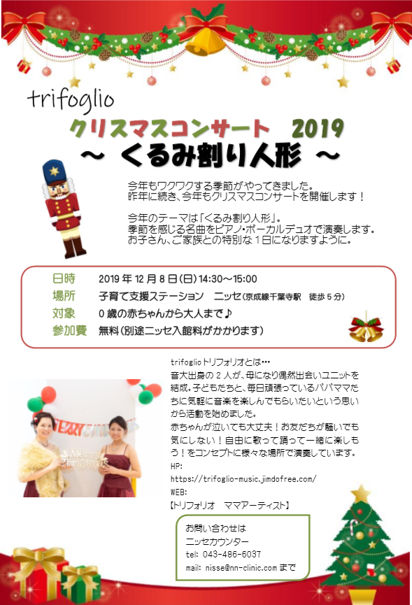 ファミリーで楽しめるクリスマスコンサートを開催します🎄 ママアーティストtrifoglio(トリフォリオ)さんによる、0歳の赤ちゃんからおとなまでファミリーみんなで楽しめるクリスマスコンサート🎅 今年のテーマは「くるみ割り人形」 季節を感じる名曲をピアノ・ボーカルデュオで届けてくださいます♪ 12月8日(日)14:30~15:00 参加費無料(ニッセパスポートをお持ちでない方は別途入館料がかかります) 予約不要です🎀
