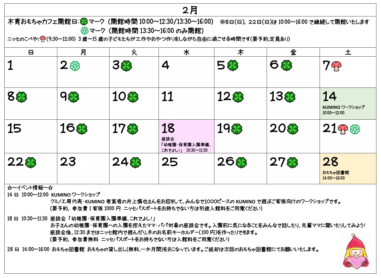 🍀マークの日が開館日 (10:00~12:30 / 13:30~16:00)です