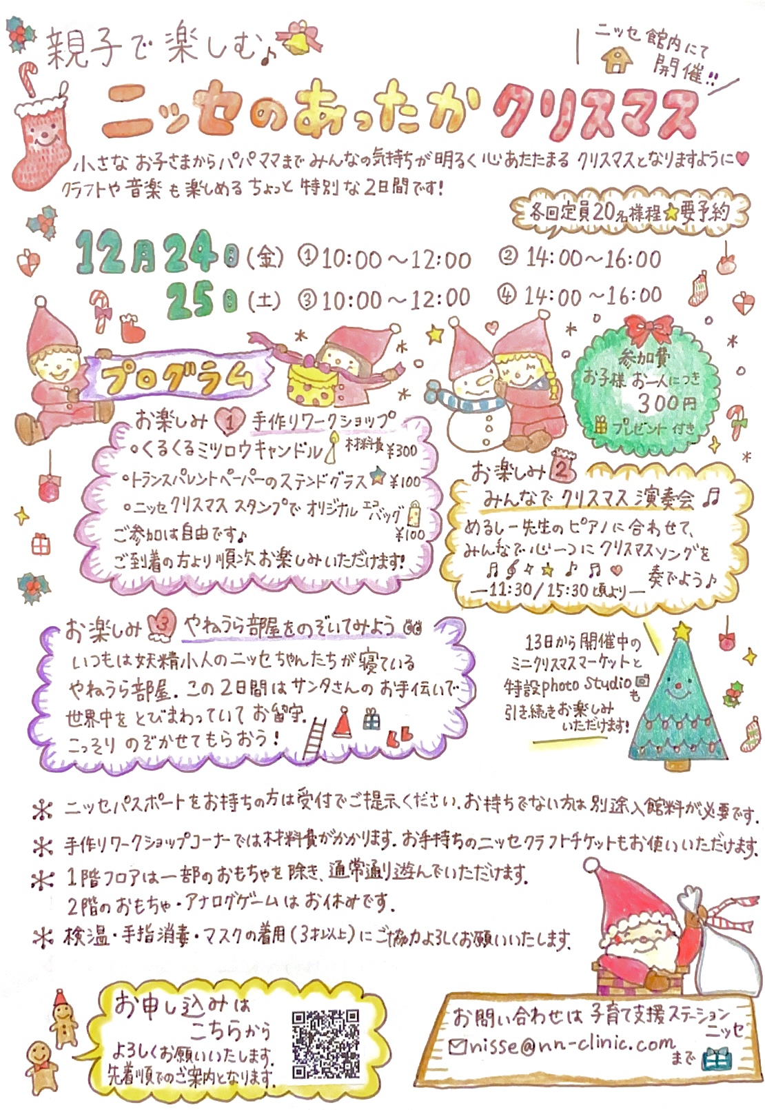 ニッセでは12月24日・25日の2日間、親子でクラフトやクリスマスソングが楽しめるちょっと特別な2日間「ニッセのあったかクリスマス」を開催します✨
