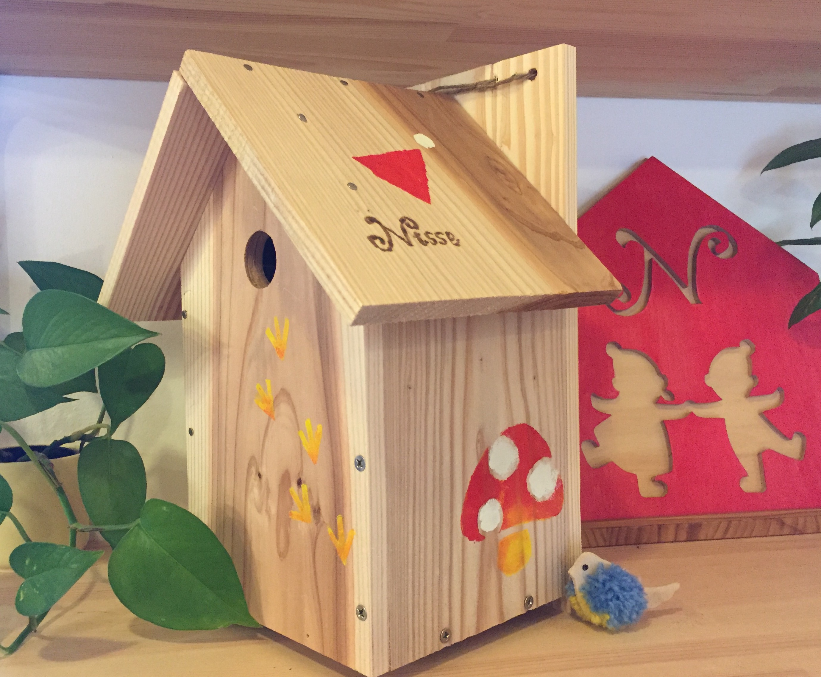バードハウスは予めサイズにカットされた板を組み合わせて作ります。お子さんと一緒に作れます。