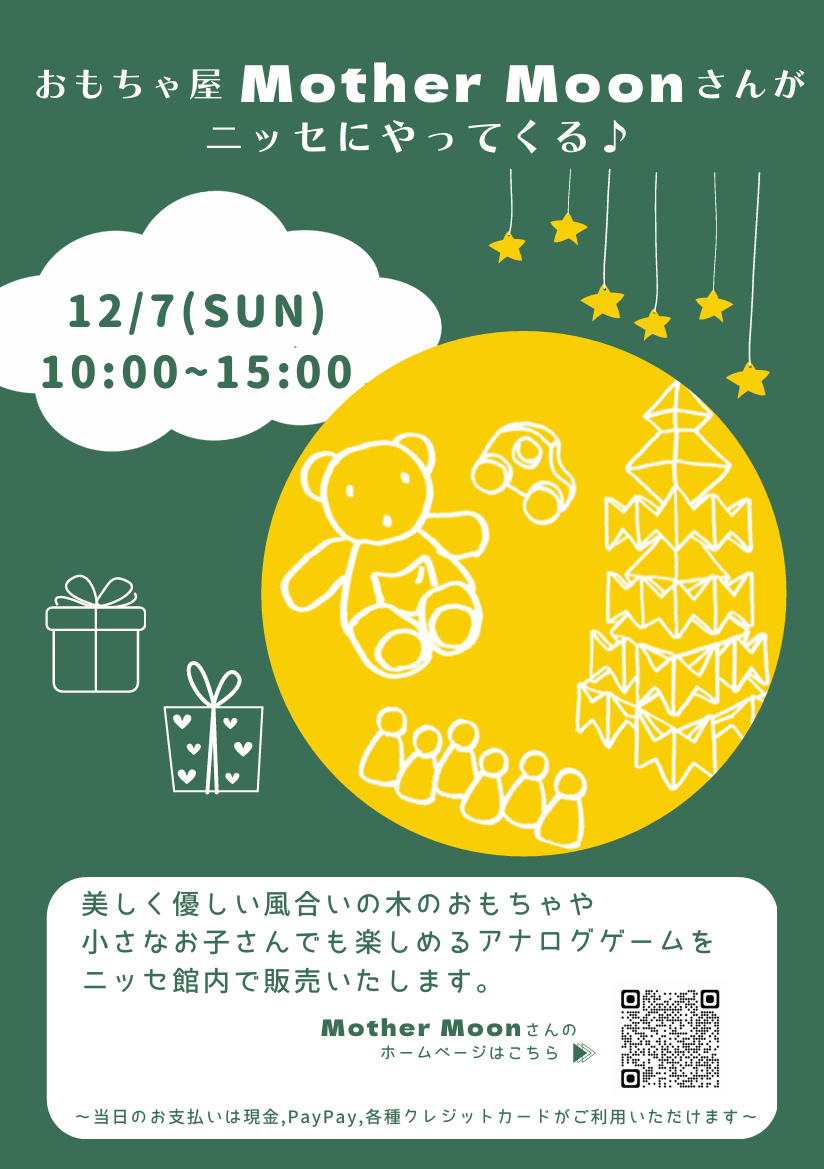 佐倉市のおもちゃ屋Mother Moonさんが、12月7日(日)10時~15時 ニッセの2階で出張おもちゃ販売をしてくださることになりました🧸